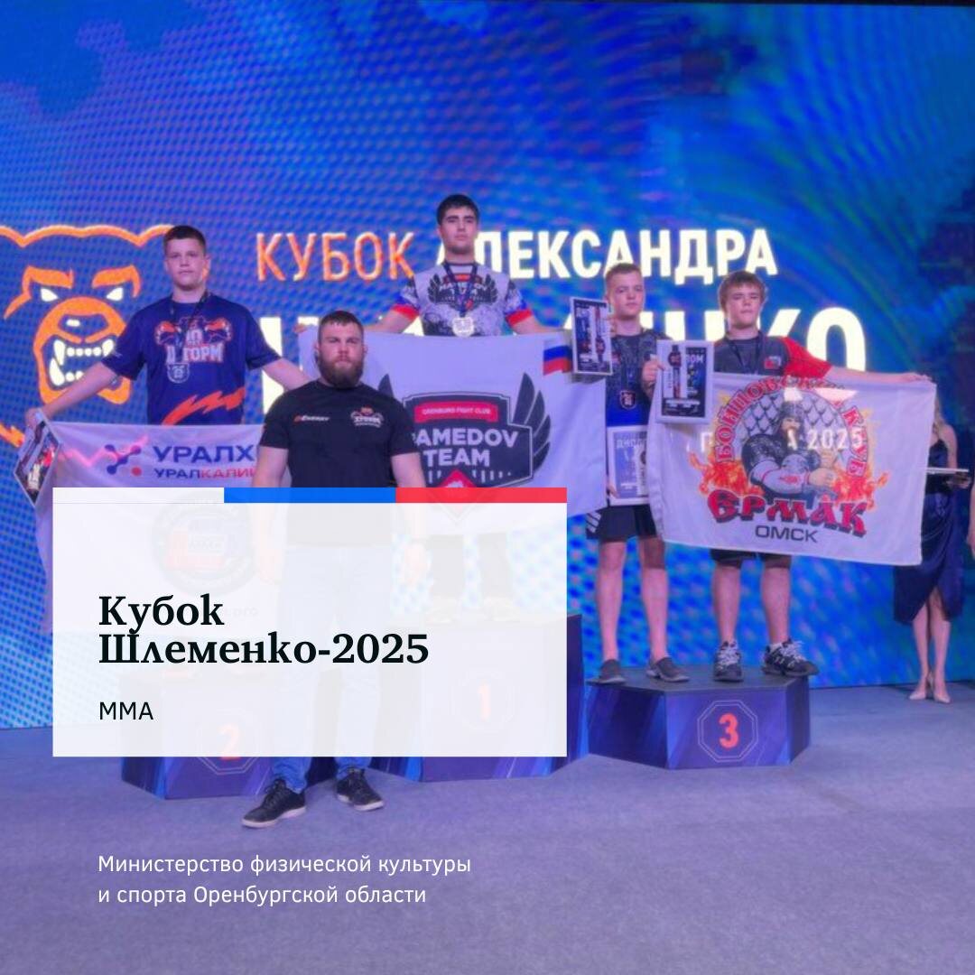 Сборная Оренбуржья по ММА заняла 2-е место на Кубке Шлеменко-2025 в Омске. Команда из 12 бойцов клуба «Мамедов Тим» завоевала медали: золото – Гюлоглан Мамедов (14–15 лет, 80 кг), Данат Абдинов (16–17 лет, 61,2 кг), Артем Рогачёв (18–20 лет, 83,9 кг, норматив МС России); серебро – Саламбек Фезлиев (14–15 лет, 57 кг), Ибрагим Фезлиев (16–17 лет, 65,8 кг); бронза – Сергей Багута (16–17 лет, 57 кг).