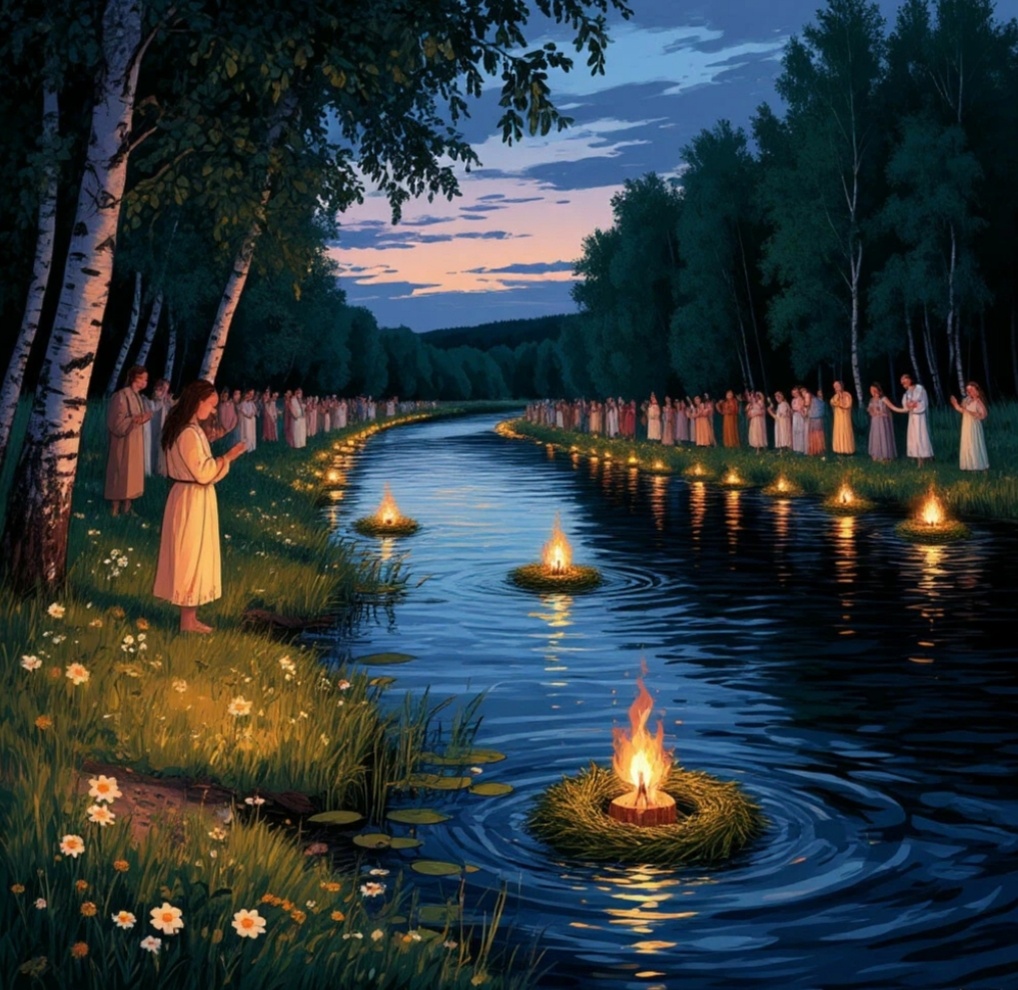 Представьте, как прекрасна и поэтична была эта картина: по реке в темноте плывет множество огней, а по берегам застыли в тревожном молчании люди. Этот обычай возродился в наше время в иных символах: венки с горящими огнями опускаются в воду и плывут по рекам, как знак памяти о погибших на морях. Опускаются венки и на месте гибели кораблей. А у костров длится веселье. Иногда в середину костра ставили шест с укрепленным на нем огненным колесом - символом солнца, и всю ночь прыгали через костры юноши и девушки, а те, кто думал пожениться, держались за руки крепче, ибо, по примете, если руки не разожмутся - быть свадьбе. Старались прыгнуть повыше: кто прыгнет выше всех, будет самым счастливым в грядущем году. В огне матери сжигали сорочки, снятые с больных детей, считая, что от этого пройдут все болезни; старики сидели поодаль, переговаривались, попивая хмельную брагу и пиво и вспоминая свои прошлые лихие купальные ночи; молодежь продолжала веселиться, а самые смелые шли собирать заветные травы: сорванные в этот день, они обладали особой силой.