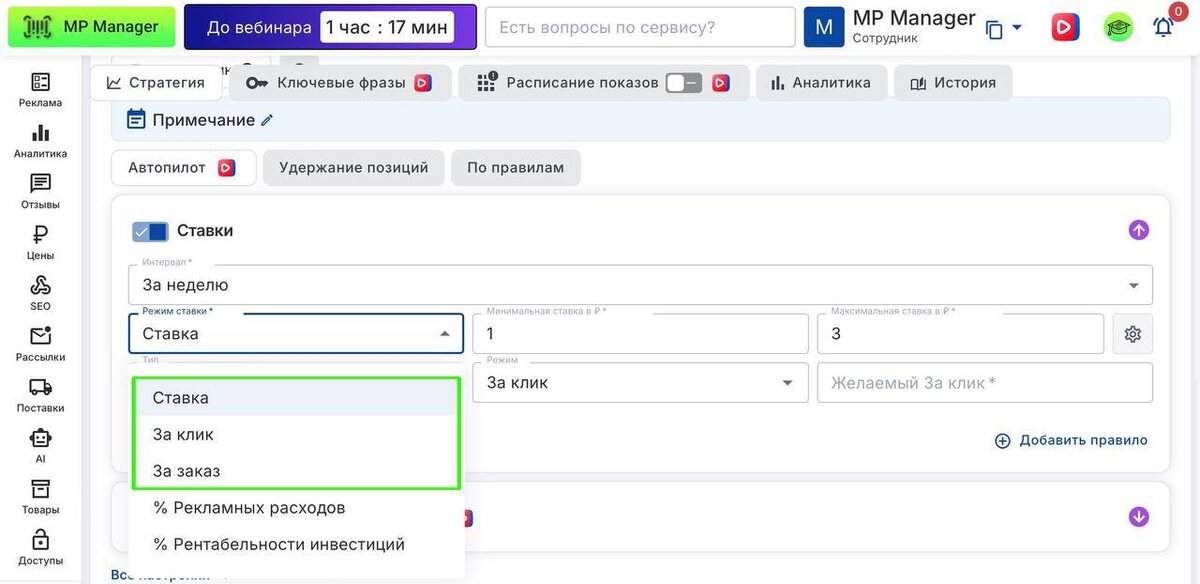 💙 Теперь и для Ozon: границы ставок по воронке продаж Хорошие новости — в MP Manager появилась возможность управлять ставками на Ozon не только по фиксированной сумме, но и по ключевым метрикам воронки: 🎯 Доступные режимы ставок: • Ставка • За клик • За заказ • % рекламных расходов • % рентабельности инвестиций ⚙️ Что это даёт: — Больше гибкости: можно ставить ограничения по эффективности, а не просто по бюджету — Удобная настройка под реальные цели: удержание нужной доли рекламных расходов, работа по целевой стоимости одного заказа, контроль рентабельности и другие параметры. — Управление аналогично тому, как это работает для WB: знакомая логика — в новом месте 📌 Границы можно задать в рамках стратегий по правилам — по интервалу (например, за неделю) и с точной детализацией по типу метрики. 💡 Используйте это обновление, чтобы: • быстро адаптировать рекламу под изменение себестоимости и маржи • задать безопасные рамки расходов • исключить неэффективные фразы без вручную анали