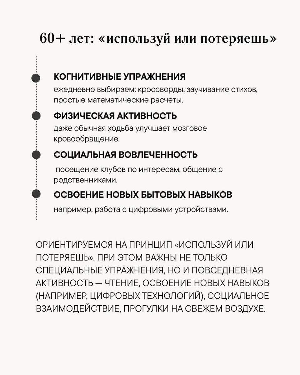 Инвестиции в развитие своего интеллектуального потенциала — залог успешного будущего! Мы подготовили простую инструкцию, которая позволит поддерживать мозг активным и молодым независимо от возраста: будь вам 20, 30, 40 или даже 60 лет! ✅ Что такое когнитивный резерв? Это способность нашего мозга компенсировать возрастные изменения благодаря накопленному опыту и знаниям. Регулярная стимуляция умственной активности позволяет мозгу оставаться пластичным и эффективно решать новые задачи. 🔍 Основные рекомендации: 1️⃣ ☑️ Постоянно учитесь новому: изучайте иностранные языки, осваивайте музыкальные инструменты, занимайтесь творчеством или новыми видами спорта. 2️⃣ 🧠 Тренируйте память и внимание: решайте головоломки, кроссворды, играйте в шахматы или карты. 3️⃣ ✨ Разнообразьте круг общения: знакомьтесь с людьми разных возрастов и профессий, обменивайтесь опытом и знаниями. 4️⃣ 🚴 Ведите активный образ жизни: регулярные физические нагрузки улучшают кровообращение и питание мозга кисло