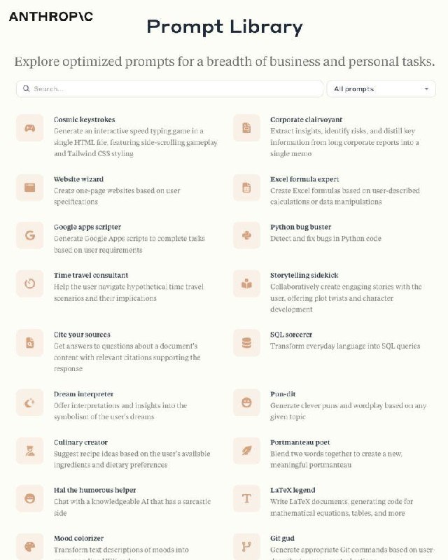 ⌨️Anthropic выпустила библиотеку промптов с 64 промптами! Это обширная библиотека промптов, включающую 64 готовых промпта для самых разных задач 🤖 Экономим ресурс для тех, кто хочет оптимизировать свою работу с ИИ. 🙅♂️ Я выбрал 4 наиболее полезных промпта, которые вы можете начать использовать уже сегодня: ➡️Product naming pro (Профессионал по наименованию продуктов): Поможет вам создавать креативные, запоминающиеся и, что самое главное, продаваемые названия для ваших продуктов. Ваша задача — сгенерировать креативные, запоминающиеся и продаваемые названия продуктов на основе предоставленного описания и ключевых слов. Названия продуктов должны быть лаконичными (2-4 слова), образными и легко понятными целевой аудитории. Избегайте общих или слишком буквальных названий. Вместо этого стремитесь создать название, которое выделяется, передает суть продукта и оставляет неизгладимое впечатление. ➡️Brand builder (Создатель бренда): Мечтаете о сильном и узнаваемом бренде? Этот промпт пом