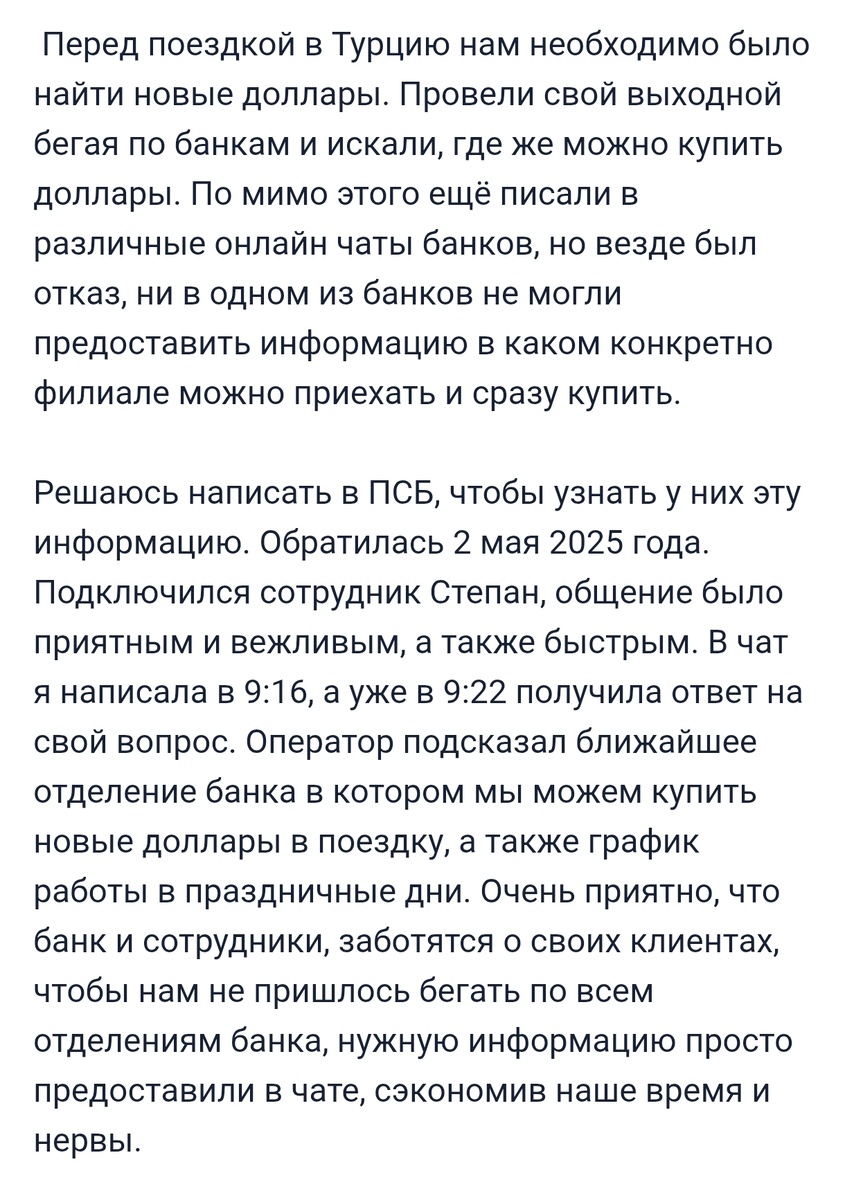 Кажется, я познала секрет написания отзывов на банки. Набила шишки, но зато теперь знаю, что я делала не так, а как нужно было делать. Потратила на свои ошибки много времени, какое-то количество денег также упущено). Но зато теперь есть чем поделиться. Думаю, многим будет полезно. В мае оставила 7 отзывов, из них зачли 2 😁 Какие отзывы не зачли и почему? Отзыв на ПСБ. Решила написать о реальной ситуации, так как доллары мы действительно покупали, вот только в другом банке. Кстати найти новые доллары тот ещё квест, по хорошему курсу их почти нигде нет, либо забирают тут же, как только они появляются. Возможно, даже сотрудники банка для себя или знакомых. Когда мы наконец-то уже купили, мы от знакомого узнали, что он обычно их всегда находит как раз в банках ПСБ, поэтому решаю написать в поддержку четкий вопрос: " в каких отделениях банка в городе Рязань, можно купить новые доллары?" И на удивление мне приходит ответ от сотрудника со списком отделений. Я была в приятном шоке, потому чт