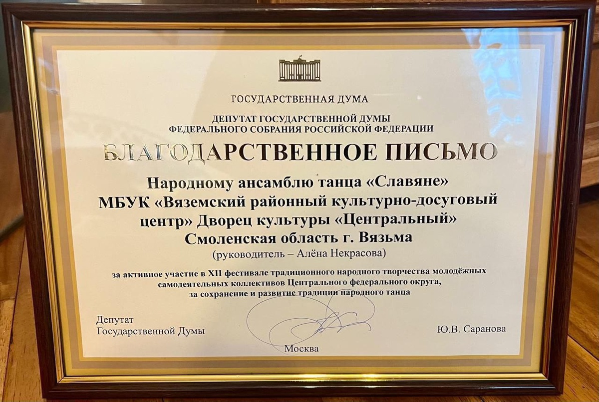 ✨️Накануне в Калязине Тверской области прошел XII фестиваль традиционного народного творчества молодёжных самодеятельных коллективов ЦФО. В этом году мероприятие было посвящено 80-летию Великой Победы. 🎉Фестиваль объединил лучшие народные ансамбли и сольных исполнителей из Московской, Ярославской, Тверской, Рязанской, Смоленской, Калужской и Архангельской областей. ✨️Смоленщину на фестивале представил народный самодельный коллектив ансамбль танца "Славяне" (ДК "Центральный", г. Вязьма) под руководством Алены Некрасовой и педагога-репетитора Валерия Сидора. 🎉Коллектив стал обладателем диплома III степени в номинации "Хореографическое исполнительство" и приза зрительских симпатий. Руководители коллектива были награждены благодарственными письмами депутата Государственной Думы Юлии Сарановой. 👏Поздравляем с заслуженными наградами и желаем дальнейших творческих успехов! #ДелимсяДостижениямиКоллективов #СмоленскийЦентрНародногоТворчества