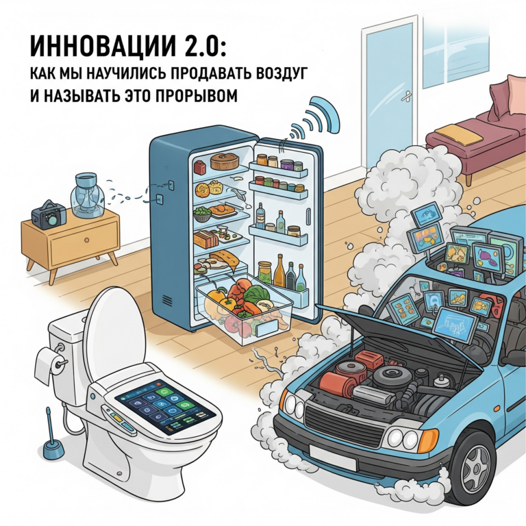 Добро пожаловать в мир, где слово “инновация” означает ровно столько, сколько в него вложили маркетологи перед ужином. Где каждый день нам презентуют “революционные” технологии, которые на поверку оказываются старыми идеями в новом корпусе. Где “умный” холодильник знает, что у вас закончилось молоко, но не знает, как перестать зависать при попытке открыть дверцу. Мы живём в золотую эру псевдопрогресса, когда настоящие изобретения прячутся где-то между патентными бюро и YouTube-каналами с 5 подписчиками, а на передовой — “умные” унитазы с идентификацией пользователя по анусу. Но давайте разберёмся, как мы дошли до жизни такой.