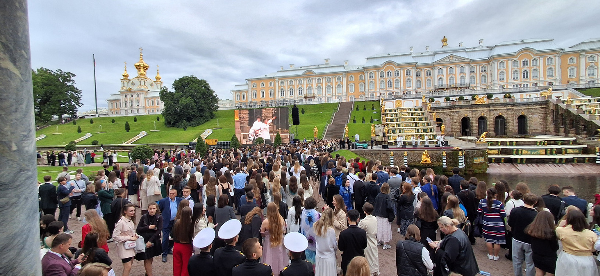 Бал медалистов, судя по всему, устроен с неменьшим размахом, чем Алые Паруса, хоть и более камерно. Перекрыли часть улиц в самом Петергофе, ведь нужно разместить для стоянки около ста автобусов, на которых приехали выпускники и после будут возвращения обратно. Расставили по периметру солдатиков Росгвардии, внутри бравые ребята в штатском... Короче, безопасность на уровне. На входе строгий "шмон", отбирают даже воду. Никакой еды, напитков и прочих "излишеств" с собой нельзя. На территории много пунктов раздачи бутилированной воды, а еды вовсе не было. Ну, и не беда, питаемся пищей духовной...