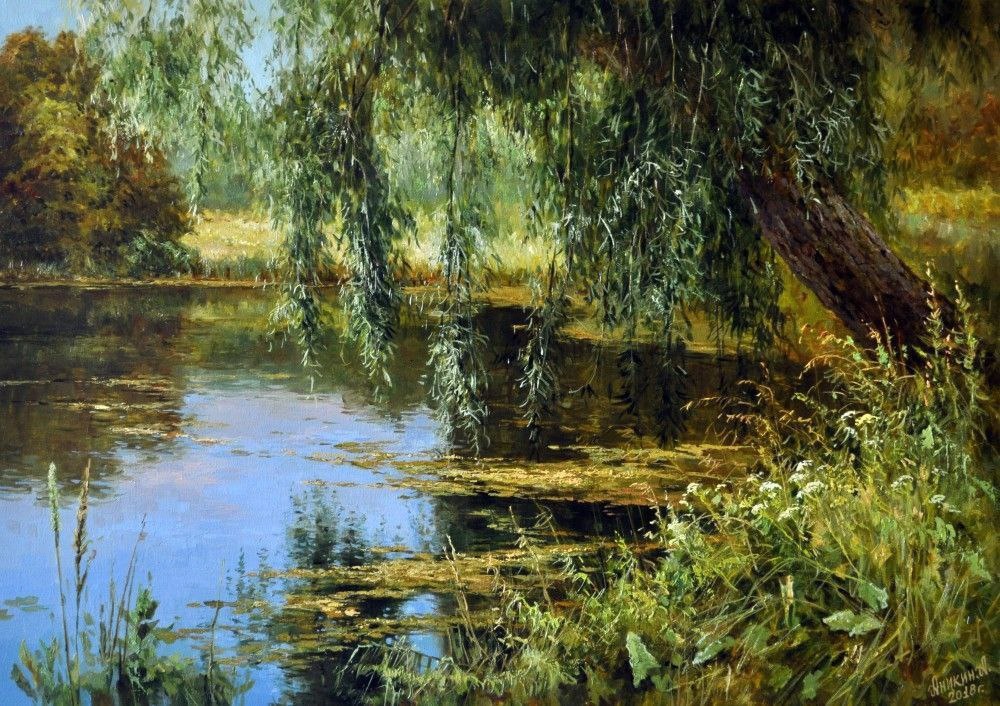 Душа русской природы в традициях современной реалистичной живописи на полотнах современного художника-пейзажиста Алексея Аникина. Огромное количество оттенков зелёного поражает своим разнообразием, а грамотное владение основными принципами теплохолодности помогает передать состояние природы, - тепло летнего солнца и прохладу теней.