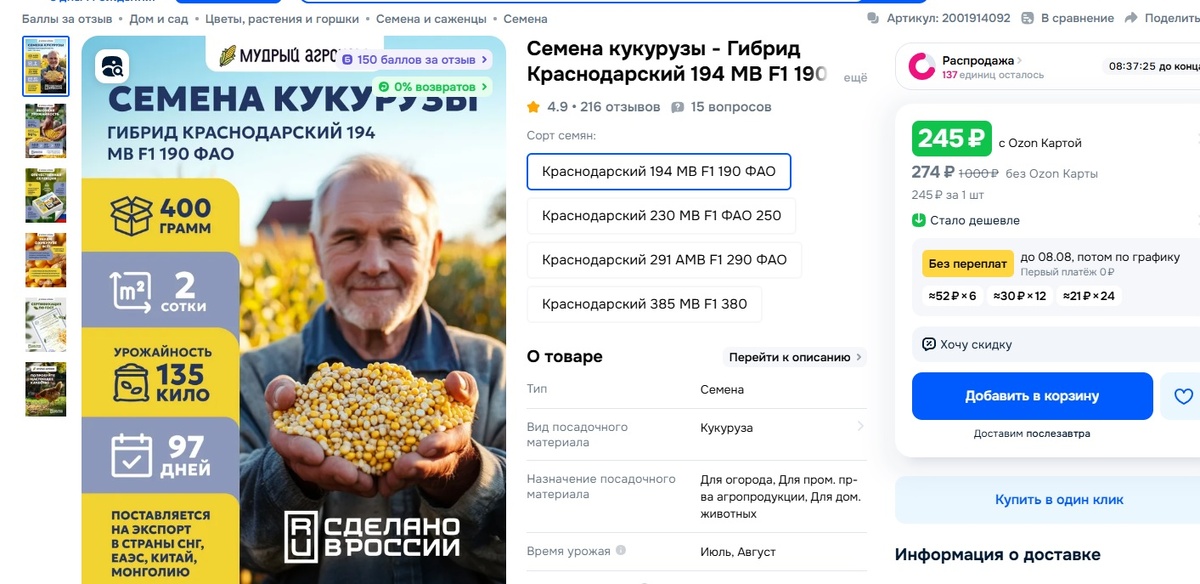 Если Вы такой же фанат покупок на Ozon как и я (если что - это не реклама, просто делюсь своей находкой), то Вам может быть интересна следующая информация. Сегодня, 2 июля 2025 года, на озон есть акция , по которой можно купить семена кукурузы 300 г фактически за 95 рублей. Поэтому если решите покупать, лучше не медлить, т.к. акции обычно длятся не долго. У меня подписка на Ozon премиум, поэтому цена для тех у кого эта подписка, 245 рублей, без карты 274 рубля. Покупаем эту кукурузу. После того как ее получим, оставляем отзыв, и за этот отзыв нам начисляют 150 баллов именно от озон, не от продавца. А дальше уже можем тратить эти баллы на любые нужные покупки, т.е. 150 рублей у нас в кармане. Таким образом, 245 - 150 = 95 рублей нам обойдутся 300 грамм семян кукурузы. Правда, срок годности этих семян я так и не смогла найти на странице продавца. Но рейтинг товара 4,9 из 5, что вселяет надежду на богатый урожай. Думаю, рискнуть можно. Надеюсь, информация была Вам полезной. Кстати, виде