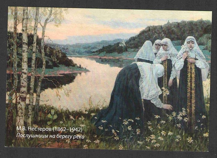 В мае 2012 года салаватский любитель старых ценных бумаг Р.Ф. Сайфутдинов, интересующийся и знаками почтовой оплаты, принёс в наш клуб двустороннюю открытку с репродукцией картины М.В. Нестерова «Послушницы на берегу реки».