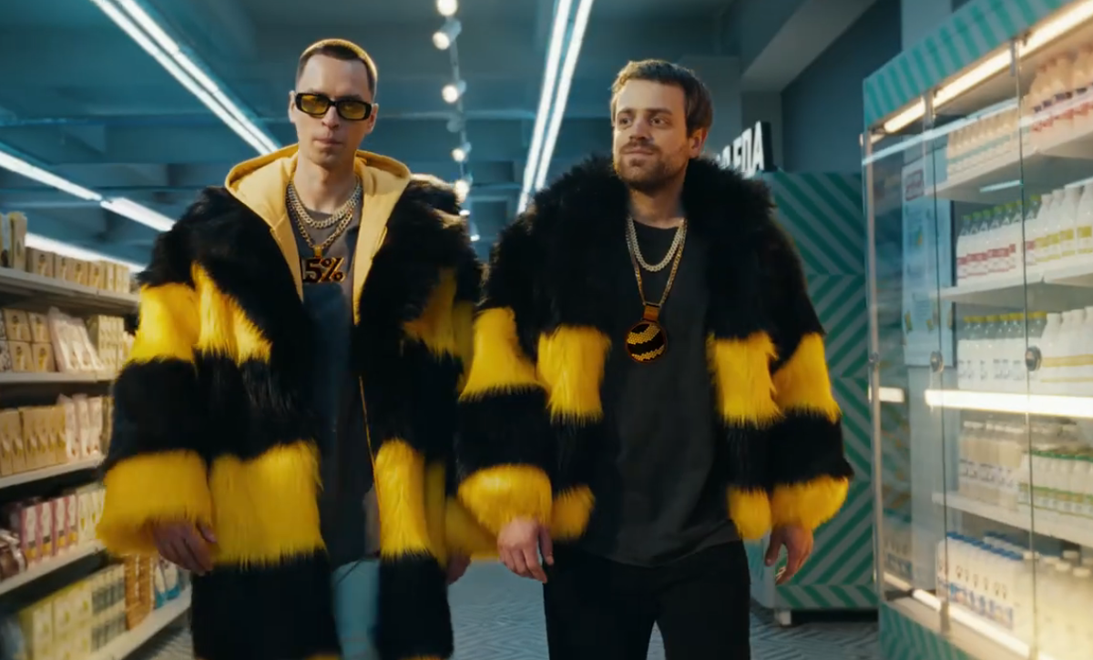 Билайн сделал рекламу, где заколлабился с Пятерочкой. Именно такие мысли приходят в голову, когда впервые видишь это.. Причем, в ролике Би-лайн коронует "Королей магазина", где кэш-бэк стал поводом для хита.. Там очень вирусный ролик, где использовали запоминающийся рэп-трек "Короли магазина". И запоминающиеся лица, жесты, манеры. Они уверенно шагают по торговым рядам в экстравагантных шубах цветов Билайна. У них королевские жесты, они бросают продукты в корзину без взгляда на ценники, это визуализация выгоды от кэш-бэка? Это рэпер Антон Солдатов (известный как музыкант TonySouljah) и актёр театра и кино Антон Кривохин. Также снимаются в роли надувающих жвачку сёстры-близняшки Диана и Ника Дроковы. И актриса Дарья Войновская в роли впечатлённой покупательницы. Рекламный текст и песня: