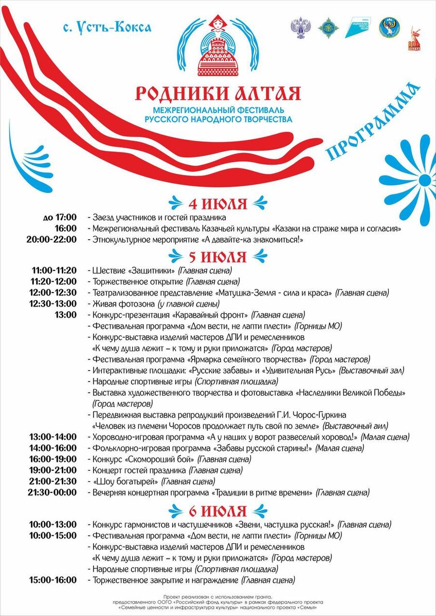 С 4 по 6 июля в Усть-Коксе состоится фестиваль русского народного творчества «Родники Алтая