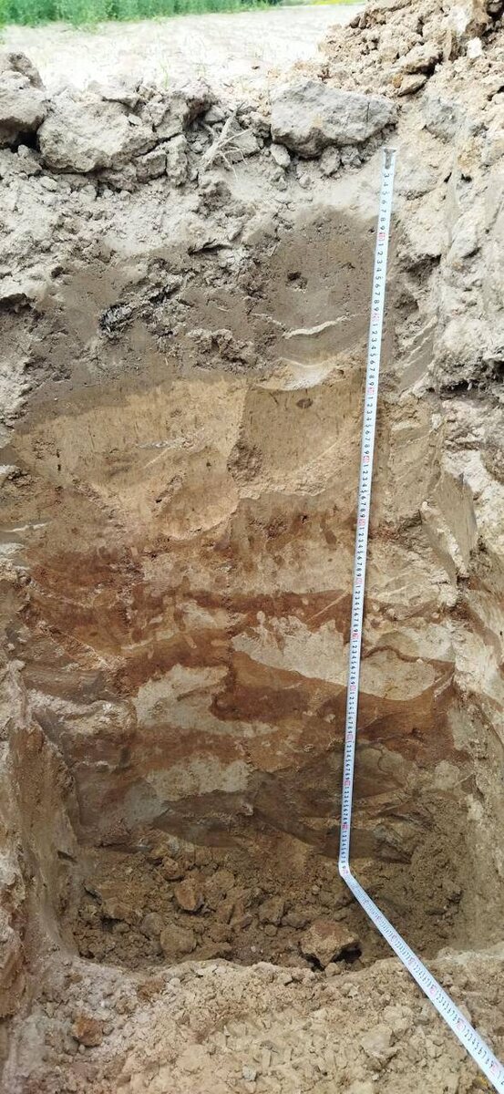 Фото 2 — нарушенная супесчаная почва на моренных отложениях — очень интересный случай! Залегает у подошвы склона южной экспозиции крутизной 3-5 градусов (эрозионная опасность!) и имеет опесчаненный профиль.