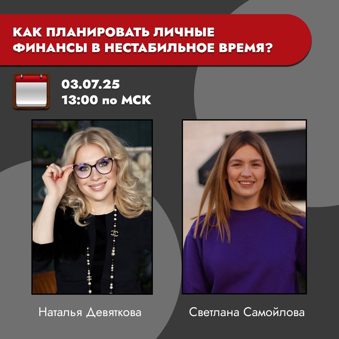 🔁 ПО ВАШИМ ПРОСЬБАМ | Как планировать личные финансы в нестабильное время? Записи прошлого эфира не было, поэтому по многочисленным просьбам мы проведем прямой эфир еще раз! Так что если вы не смогли попасть в прошлый раз - обязательно приходите. 💡 На эфире вы узнаете: — Как всего за 6 шагов разобраться с личными финансами — 2 ключевых показателя, которые показывают, растёт ли ваш капитал — Как начать инвестировать на фондовом рынке, даже с нуля — Что работает в нестабильности и как на этом зарабатывают инвесторы Обо всем этом расскажет Светлана Самойлова https://t.me/Svetlana_Finliberty — • Независимый финансовый консультант с опытом 17+ лет • Сооснователь проекта FinLiberty • Преподаватель школы независимых финансовых консультантов • Квалифицированный инвестор и практик 👥 Эфир для вас, если: — Вы не знаете, с чего начать инвестировать — Хотите распределить активы по “разным корзинкам” — Хочется порядка в личных финансах и стратегии на ближайшие годы 📆 Дата и время: Завтра, 1