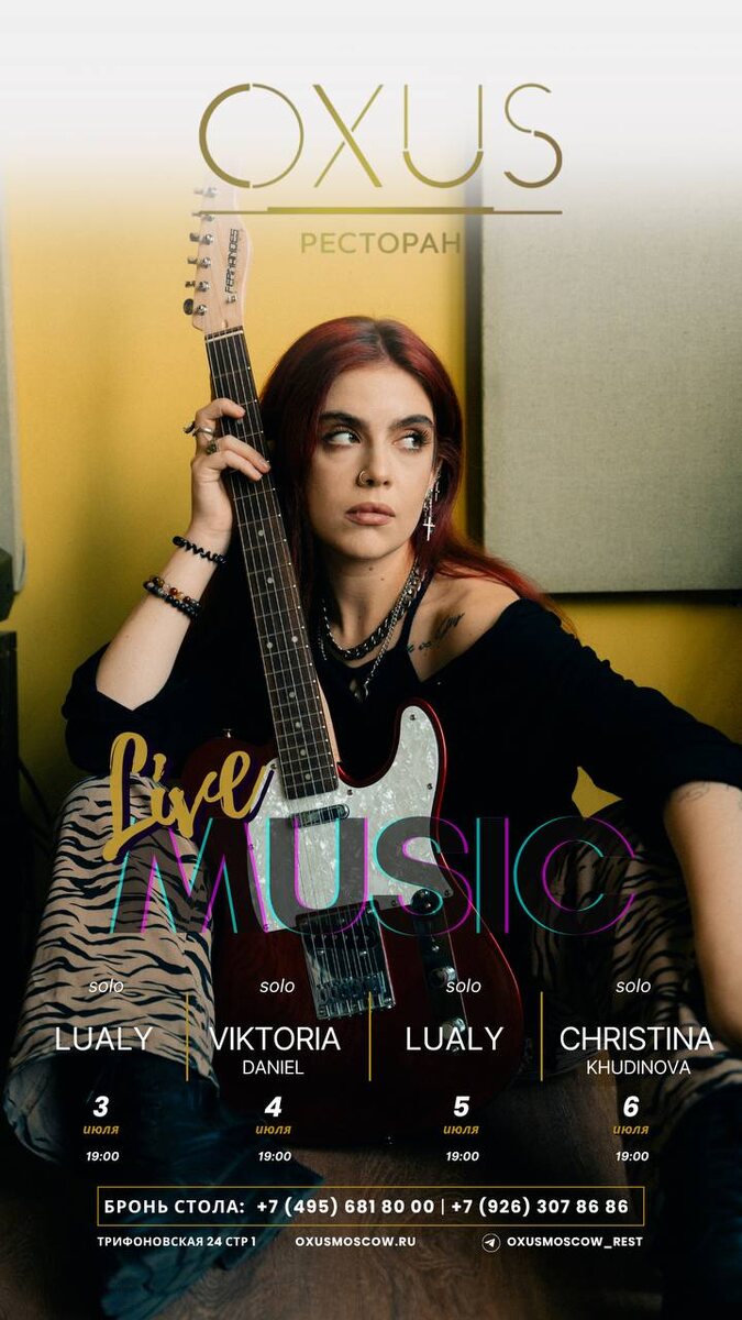 Июнь пролетел как пролог, первый акт летней пьесы, а июль обещает интересную завязку сюжета с развитием событий… Июльский сюжет в OXUS под музыку: 03.07 | четверг | 19:00 | LUALY | solo 04.07 | пятница | 19:00 | VIKTORIA DANIEL | solo 05.07 | суббота | 19:00 | LUALY | solo 06.07 | воскресенье | 19:00 | CHRISTINA KHUDINOVA | solo Ресторан OXUS +7(495) 681 80 00 +7(926) 307 86 86 (WA/TG) Сайт, telegram