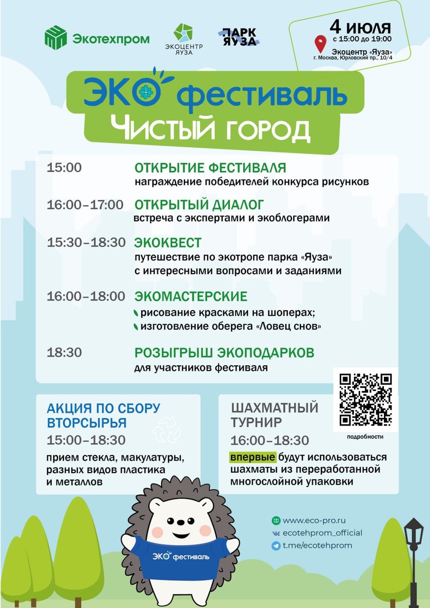 ♻️ Экофестиваль «Чистый город» уже совсем скоро! Ещё не решили, как провести вечер пятницы? Самое время внести в планы посещение экоцентра «Яуза»! 🗓 4 июля с 15:00 до 19:00 вас ждет яркая и насыщенная программа от АО «Экотехпром»: 🟡 творческая мастерская для детей 🟡 лекции об экологии и раздельном сборе 🟡 турнир по экошахматам 🟡 встреча с эко-блогерами 🟡 экологический квест и многое другое! Приходите всей семьей — будет празднично, интересно и по-настоящему полезно! 🎟 Вход свободный. ⭐️ ДЖКХ Москвы — подпишись!