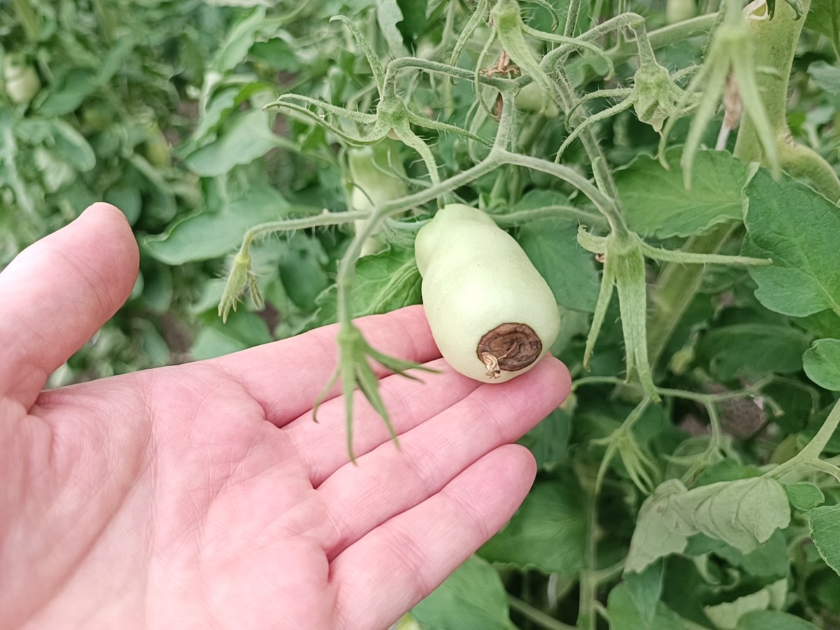 Дождливый июль принёс неприятный сюрприз. На красивых крупных томатах появились тёмные пятна на верхушках. Вершинная гниль! Многие думают — это болезнь или вредители. Нет. Это нарушение питания. Растению не хватает кальция именно тогда, когда плоды активно наливаются. Хорошая новость: проблема решаемая. Главное — действовать быстро. Вершинная гниль — тёмное вдавленное пятно на верхушке плода. Сначала сухое. Потом размягчается и гниёт. Поражает чаще крупноплодные и особенно вытянутые сорта. Особенно в теплицах. Не заразна — не передаётся другим растениям. Активный рост плодов требует много кальция. Корни не успевают его доставить. Дожди вымывают кальций из почвы. Особенно на лёгких песчаных грунтах. Переувлажнение почвы нарушает работу корней. Они не могут усваивать питательные вещества. Кальций отвечает за прочность клеточных стенок. Его нехватка делает ткани плода слабыми и склонными к разрушению. Парадокс: в почве кальция может быть достаточно. Но растение его не усваивает. Засуха →