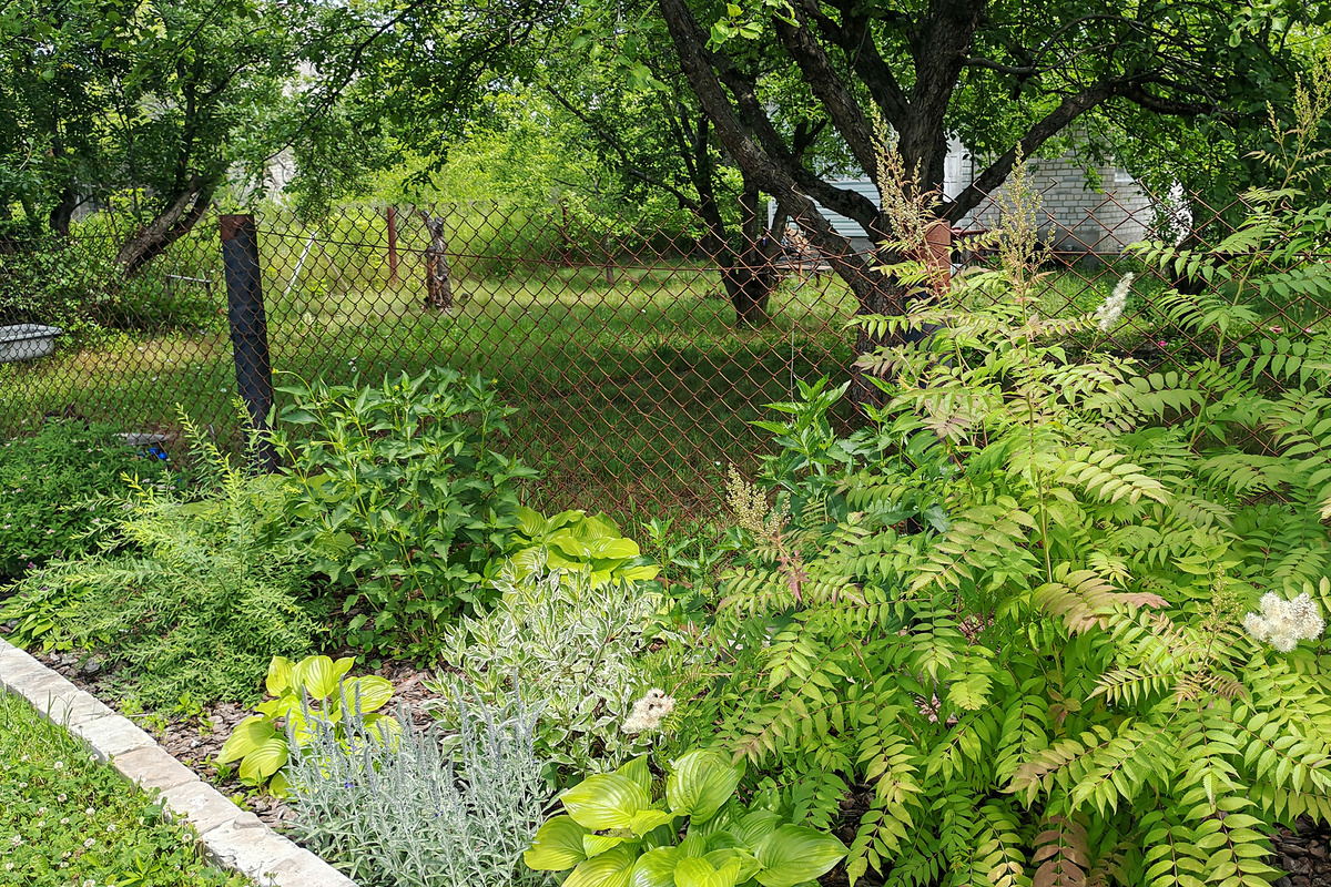 Как здорово, когда можно уже показать фото ДО и ПОСЛЕ! Точнее, это ДО и СЕЙЧАС, так как нужный объём ещё не достигнут. Но - всё идет по плану :) Про этот теневой миксбордер я рассказывала тут, и о том, как пришлось менять планы на ходу. Вот так всё начиналось, с совершенно пустого места. Ну как пустого, тут уже засажена клевером лужайка и кусты уже на местах. Это весна 2024 г. Первым делом перекопала и вычистила территорию от травы и сорняков. И высадила растения. Не всё сразу, по мере поступления. Здесь у меня рябинник рябинолистный, дерен белый "Айвори Хало", спирея серая "Грефшейм", спирея японская и барбарис тунберга "Сенсейшн". В нижнем ярусе подорожниковые хосты, стахис Монтье и вероника седая. И два гелиописа для временного создания объёма, один уже убрала (самосеется как не в себя). Затем приступила к мульчированию по уже известной технологии. Сначала вкопала кирпичи. Здесь клала плашмя, чтобы были почти вровень с землёй. Ну как же, косить удобно, колесом на плоский бордюр нае