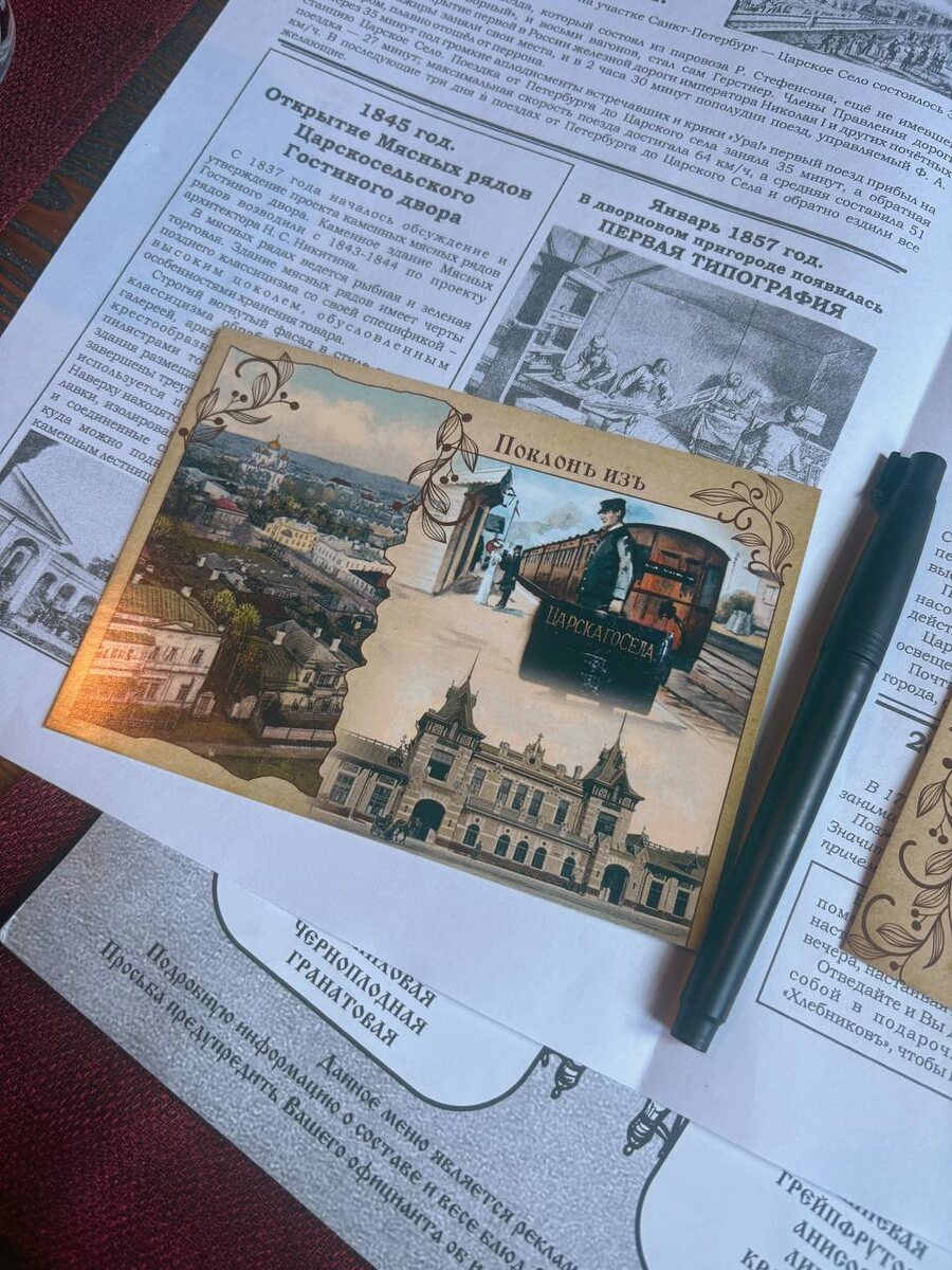 Делюсь вкусным местом в Пушкине — всего в 500 метрах от Екатерининского дворца. Это ресторан «Хлебниковъ». Мы о нём не слышали, но взяли рекламку у милой девушки. Поскольку хотелось чего-то сытного и простого, решили туда зайти. Интерьер соответствует названию — всё оформлено в русском стиле, с множеством интересных деталей. Внутри есть даже небольшой музей самоваров. Атмосфера очень приятная и тёплая. Приятным бонусом стало то, что официант угощает настойками. А ещё они сами пекут свой хлеб! Меню большое и мясное :) Русская кухня, сытная и разнообразная. Голодными точно не уйдёте. Есть даже дичь — для любителей чего-то необычного. Перед едой приносят газету с историческими фактами о Пушкине, о том, что ели раньше, и в честь кого названы некоторые блюда. Нам повезло — мы пришли первыми, а потом народ начал активно подходить. Что заказали: драники, уху, гуляш, котлеты из лося и вкусный домашний квас. Пока ждали еду, можно было отправить открытки близким — классная деталь, которая добавл