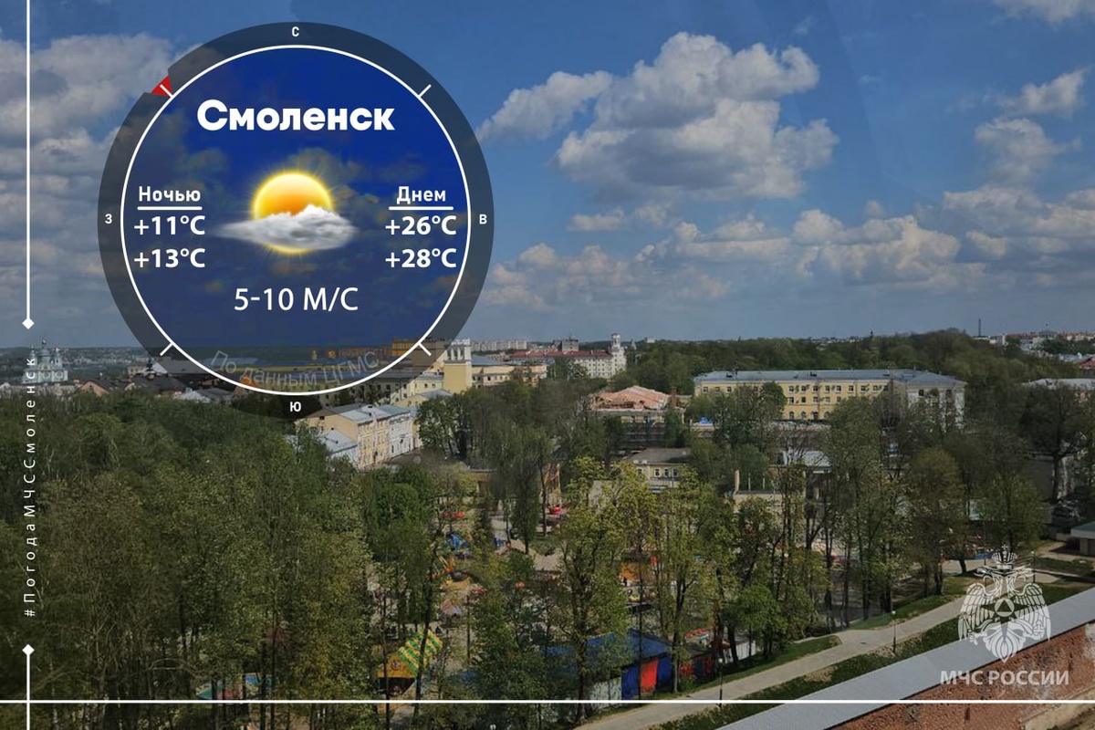 по Смоленску: ночью +11°C…+13°C, днём +26°C…+28°C.