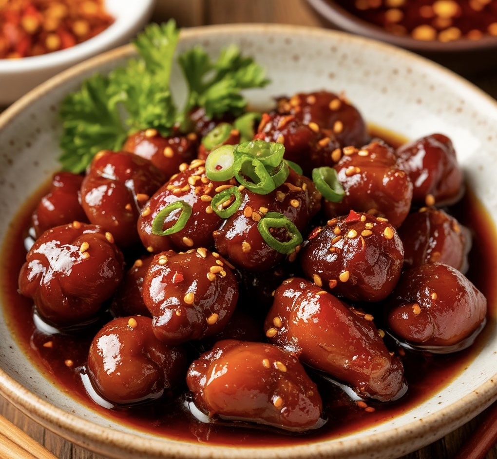 Это блюдо — настоящий танец контрастов: сладкий мёд встречается с острым чили, глубокий соевый аромат переплетается с сочными овощами, а нежные куриные сердечки создают невероятную текстуру, от которой невозможно оторваться. 🧾 Ингредиенты (на 2–3 порции): - Куриные сердечки – 500 г - Лук репчатый (красный) – 1 шт. - Болгарский перец – 1 шт. - Морковь – 1 средняя - Чеснок – 2 зубчика - Соевый соус – 2 ст. ложки - Острый соус (чили, табаско или паста чили) – 1 ч. ложка (по желанию больше) - Мёд (или коричневый сахар) – 1 ст. ложка - Устричный соус – 1 ст. ложка (по желанию, он очень усиливает вкус) - Растительное масло (лучше арахисовое или кукурузное) – 2 ст. ложки - Соль – по вкусу - Чёрный молотый перец – по вкусу - Кунжут (семена) – для украшения - Зелёный лук – 2–3 стебля 🔪 Что нужно сделать перед началом: 1. Подготовьте сердечки: - Промойте их в холодной воде. - Очистите от лишних прожилок и жира. Это важно для мягкости. - Разрежьте каждое сердце пополам