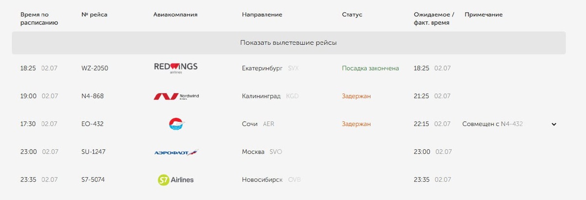 2 июля в аэропорту Оренбурга задержаны рейсы в Сочи (№ 432, «Икар», с 17:30 на 22:15) и Калининград (№ 868, «NordWind», с 19:00 на 21:25