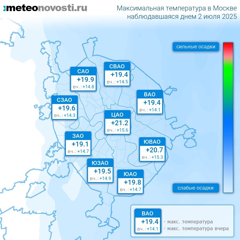 Самая высокая температура +21.2°C была зафиксирована в 16 часов в центре города, а холоднее всего было на юго-западе: +16.0°C. Разница по максимальной температуре в разных частях столицы составила за день целых 5.2°C.