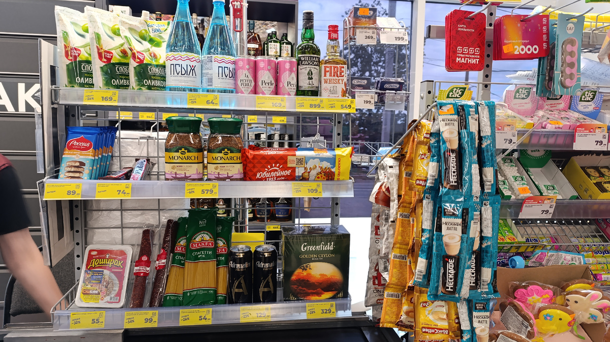 Всех приветствую, мои дорогие друзья и подписчики. Покажу вам витрину у кассы с товарами со скидкой по карте. Магазин находится по адресу Ростовская область, Зерноградский район, станица Мечётинская, улица Ленина, 50 Майонез оливковый Слобода 67 % 750 г цена со скидкой по карте 169.99 рублей. Минеральная вода Псыж питьевая газированная лечебно-столовая природная 1 л цена со скидкой по карте 64.99 рублей. Вино игристое Ла Петит Перле розовое брют 0.25 л цена 169.99 рублей. Виски Williams Lawsons 3 года 40 % 0.5 л цена со скидкой по карте 899.99 рублей. Виски купажированный Fire&Wood 0.5 л цена со скидкой по карте 549,99 рублей. Шоколадный Батончик Сникерс Супер 80 г цена со скидкой по карте 74.90 рублей. Шоколад молочный Россия пористый белый 75 г цена 89.99 рублей. Кофе Монарх Asian Selection сублимированный 180 г цена со скидкой по карте 579.99 рублей. Печенье Юбилейное традиционное витаминизированное 403 г цена со скидкой по карте 109.99 рублей. Чай Greenfield Голден Ц