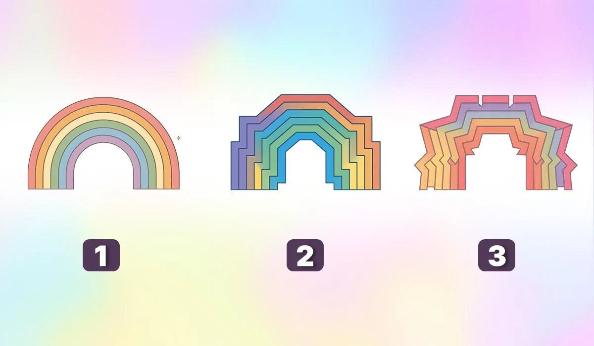 Чтоб пройти тест на личность, нужно выбрать один из трех вариантов. Не каждый задумывался, какой у него тип личности, а ведь это очень важно. Человек принимает решения, делает выборы, строит свою жизнь и на это влияет темперамент, черты характера и склонности. Простой психологический тест способен больше рассказать о человеке и определить его тип личности. Для его прохождения нужно выбрать одну из трех радуг. Нужно посмотреть на них и решить, какая из них нравится больше всего. Этот визуальный тест делит всех людей на три типа. Радуга 1 Вы яркий и энергичный человек, которые любит делиться своим энтузиазмом, исследовать новые горизонты. Для окружающих вы источник позитива, ведь ваша страсть к жизни заряжает. Кроме того, вы являетесь вдохновением для близких. Их поражает и мотивирует ваше умение всегда и во всем видеть плюсы. Само ваше присутствие заставляем других чувствовать себя более уверенными и мотивированными. На практике же ваша энергичность помогает вам преодолевать трудности и