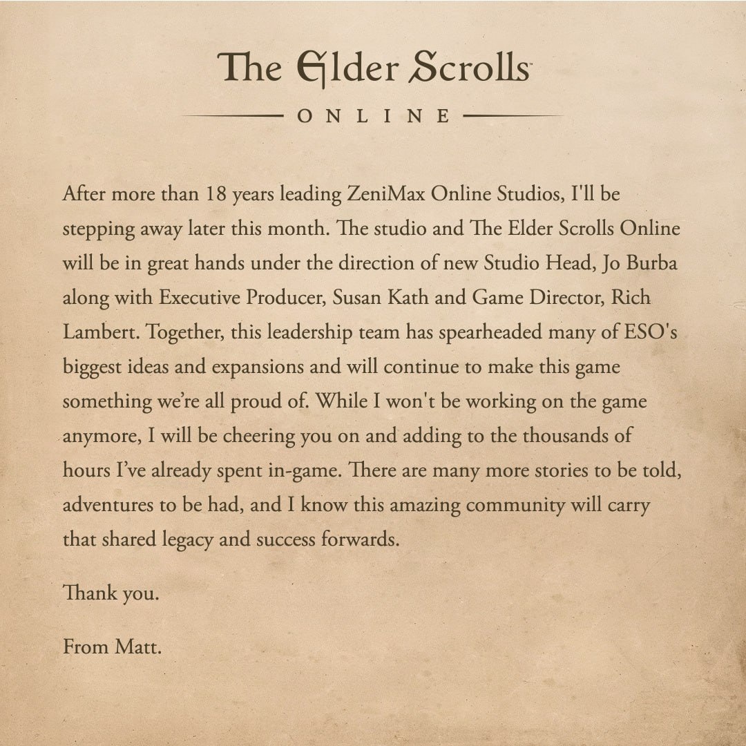 Мэтт Фирор покинет Zenimax Online Studios (The Elder Scrolls Online) после 18 лет работы. Он был президентом студии и руководителем «Свитков».