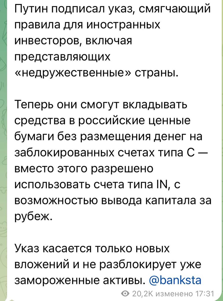 Как-то незаметно прошла эта новость. Вчера все массово писали про повышение тарифов на ЖКХ. А между прочим это по значимости не менее важное событие⬆️ Путин подписал указ, открывающий доступ иностранным инвесторам на российский фондовый рынок. Что это значит? Перевожу на человеческий язык. Не только у нас заблокированы иностранные бумаги. Зарубежные инвесторы (крупные фонды, частники) сидят с заблокированными российскими бумагами. Они не могут их ни продать, ни вывести деньги. Наши сделали это, чтобы избежать обвала на фондовом рынке (когда инвесторы массово бы продавали бумаги и забирали деньги). Плюс это позволяет иметь рычаг воздействия и возможность договариваться по обмену активами. Теперь иностранным инвесторам разрешают открывать новые счета, инвестировать в российские бумаги и даже выводить деньги. Старые счета и активы остаются заблокированными, но можно открывать новые. Почему эта новость так важна? 1️⃣ Это знак иностранным инвесторам: мы открыты и готовы принять их ден