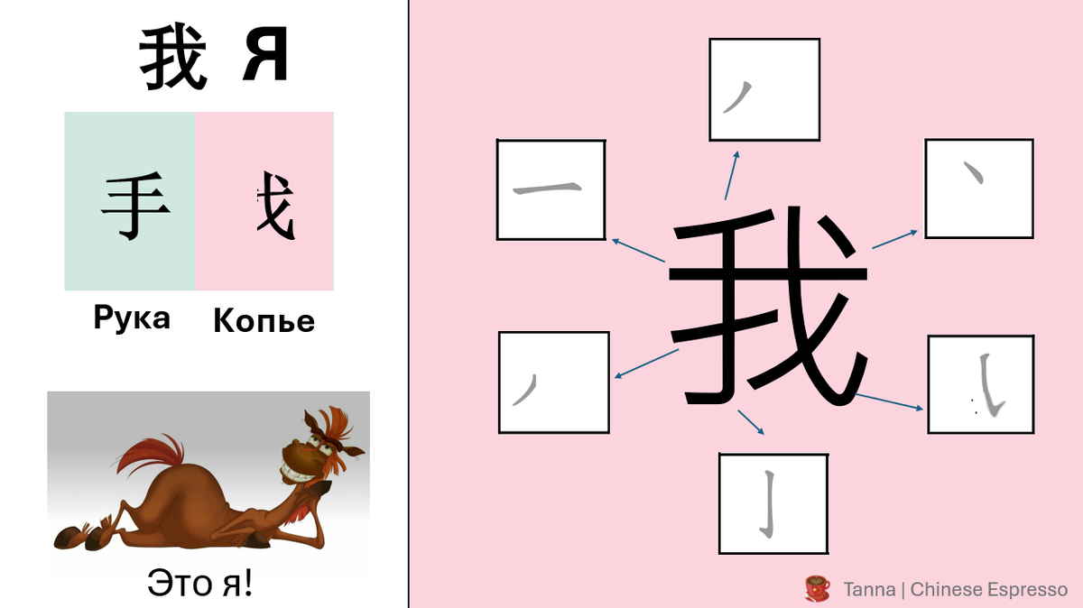 Итак, мы изучили 8 основных черт. Попробуем повторить часть из них и закрепить порядок черт. Наше первое китайское слово: «я» wǒ 我. Слово 我 состоит из двух элементов: рука и копье. Возможно, древние люди изображали себя на скалах именно как воинов с мечом. Можно запомнить это слово, представляя видеоигру: ты не видишь свое лицо, а только руку с копьем (мечом). Начинаем изучение графем (и ключей). 💎Чтобы запомнить ключи, очень важно их прописывать. Так вырабатывается моторная память. Со временем будут появляться иероглифы, очень похожие друг на друга. Прописывание поможет их различать между собой. 💎Для повторения можно использовать карточки Anki или Quizlet. Для изучения графем в уроках будут появляться карточки. Посмотрим, из чего они состоят: 🔔Колокольчик – это графема может использоваться как фонетик. 🔑Ключ – соответственно, может использоваться как ключ. 2. 人 rén «человек». Восходит к изображению человека в профиль. Ключ для слов со значением человек. Часто употребляется его