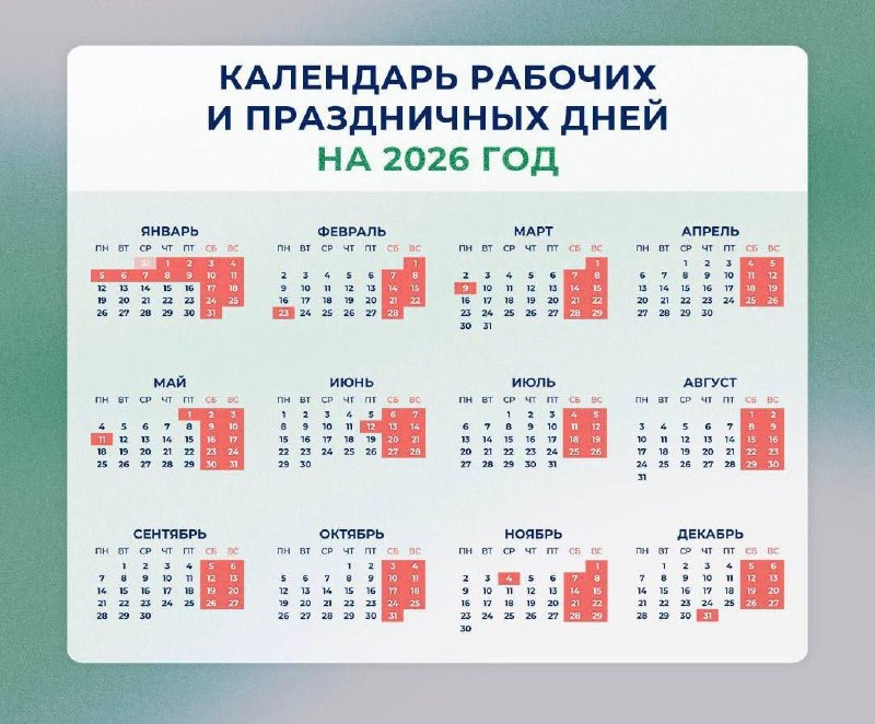 ❗️ Пока лето совсем не радует тёплой и солнечной погодой - зимой точно удастся хорошо отдохнуть и отлично встретить Новый год! 💃 Министерство труда подготовило календарь с праздничными и выходными днями в 2️⃣0️⃣2️⃣6️⃣ году! Новогодние каникулы продлятся 12 дней - с 31 декабря 2025 года по 11 января 2026! 🎇 В следующем году также нас ждут сокращённые рабочие недели в связи с Днём защитника Отечества и 8 Марта! В мае мы будем отдыхать дважды по три дня: 🔹с 21 по 23 февраля 🔹с 7 по 9 марта 🔹с 1 по 3 мая 🔹с 9 по 11 мая 🔹с 12 по 14 июня 🔹4 ноября Сохраняйте себе и отправляйте друзьям 📲 https://dzen.ru/media/id/636e2289f44ca931e5431dc7/nachinaem-chetvertuiu-nedeliu-leta-mysliami-pro-novyi-god-shampanskoe-olive-i-seledke-pod-shuboi-68594cf19148be02a7c069e4 Надеемся, ожидание приятных событий обязательно поднимет настроение, вдохновит и придаст силы не только для работы, но и на занятия спортом. Встречаемся на тренировках! 🍬 8-991-636-20-78 ❤️Ваш, СТЦМЭИ