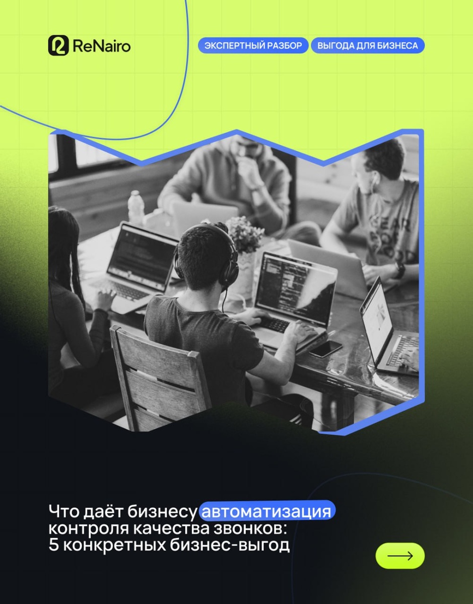 Что даёт бизнесу автоматизация контроля звонков? 🛫Полная версия статьи по ссылке на нашем сайте ✍️ Основное читайте в карточках В новой статье рассказали, как автоматизация контроля звонков помогает внедрять стандарты общения, снижать потери клиентов и делать работу менеджеров точнее. Благодаря этому лиды не теряются на старте, снижается количество конфликтов, а руководители больше не тратят время на ручную прослушку: всё важное видно сразу в аналитике. 💼 Хотите внедрить AI-анализ звонков без головной боли? Напишите — расскажем, с чего начать. А у вас контроль звонков автоматизирован? 💚 — Частично, но хотим улучшить 👾 — Всё вручную, ищем решение 🔥 — Уже работает — и это супер ReNairo