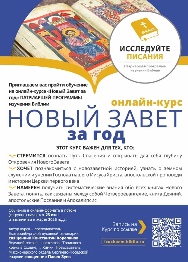 Дорогие братья и сёстры! Приглашаем вас пройти обучение на онлайн-курсе «Новый Завет за год» Патриаршей программы изучения Библии. Обучение в онлайн-формате в потоке (в группе) проходит с 23 июня 2025 года по март 2026 года. При регистрации следует выбрать вариант обучения «Ученик». Автор курса: преподаватель Екатеринбургской духовной семинарии иерей Константин Корепанов Ведущий потока: председатель Миссионерского отдела Сергиево-Посадской епархии, настоятель Троицкого храма г. Химки иерей Павел Зуев Этот курс важен для тех, кто: Ссылка на проведённый первый вебинар