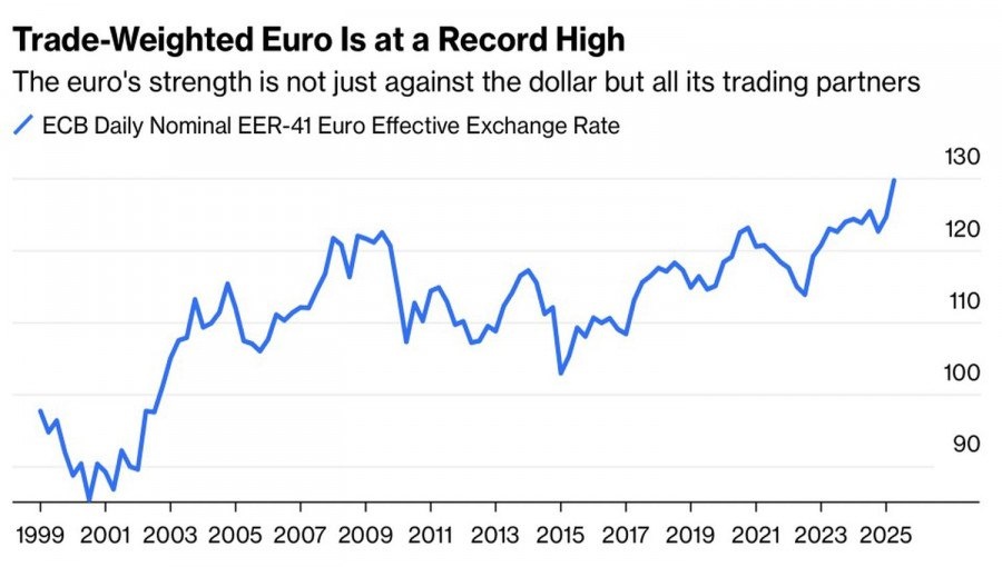 https://basechop.ru/wordpress/?p=49045 Бойтесь своих желаний. Поклонники евро верят, что EUR/USD достигнет в 2026 отметки как минимум 1,25. Однако нужно понимать, что еврозона может оставаться единым рынком. Но ее производственный импульс всегда определялся экспортом. В условиях рекордно высокого курса взвешенной по торговле региональной валюты, этот экспорт рискует затормозить ВВП и заставить ЕЦБ возобновить цикл монетарной экспансии. Динамика взвешенного по торговле евро Когда инвесторы адаптировались к тарифам, главным драйвером курсообразования на Forex вновь становится монетарная политика. И основной причиной взлета EUR/USD к области более чем трехлетних пиков являются ожидания снижения ФРС ставки по федеральным фондам на девяти ближайших встречах FOMC на целых 125 б.р. Причем этот процесс должен существенно ускориться в 2026. Именно тогда Джером Пауэлл уйдет в отставку, а на его место придет ставленник Дональда Трампа. Президент хочет выбрать человека, который будет агрессивно…
