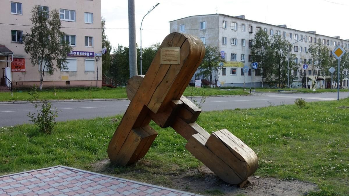 В одном месте в городе #Кандалакша (Мурманская обл) сосредоточен целый конгломерат объектов. Деревянная скульптура «Connection» – подарок финского города-побратима Кемиярви, скамейка – подарок местной масонерии, указатель направлений – тоже, наверное, чей-то подарок. © Роман Исаков