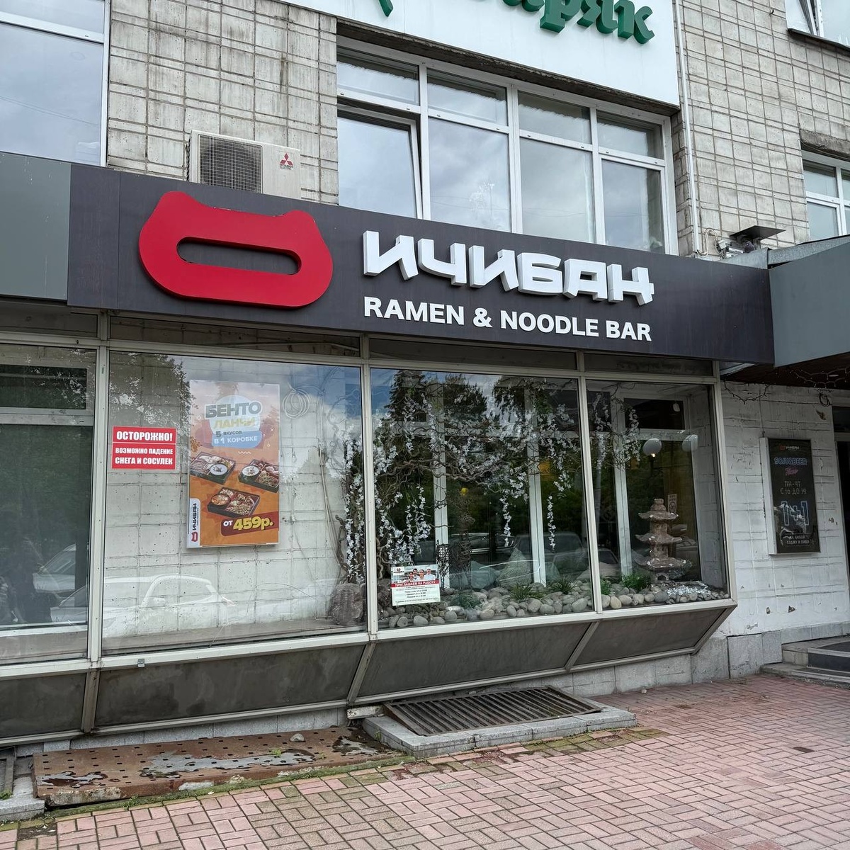 Волею случая отобедал в Ичибан ramen noodle bar. В обеденное время зал скорее пуст, чем полон. При этом обслуживание нерасторопное. То тут люди ждут, чтобы оплатить, то там кому-то даже меню не принесли. Помимо привычного меню ланча, где можно выбирать блюда, есть бенто-ланч. Говоря по нашему, комплексный обед. Его и взял. Нигири бенто по 469 ₽. В составе: Сяке Нигири, салат с жаренным цыпленком и битыми огурцами, гречневая соба с курицей Терияки, ролл с угрем и ореховым лава соусом. Плюс японский грибной суп. Написано, что «в подарок». Гречневая соба с цыплёнком. Вполне нормальная. Сверху присыпана зелёным луком и кунжутом — обычным и чёрным. В салате курица суховата, а огурцы, наоборот, хороши. Ролл с угрем и ореховым лава соусом. Рис суховат. Положение спасает соевый соус. Соус, такое ощущение, что изрядно разбавлен. Шапка из орехового лава соуса на вкус чуть кислит. Возможно, это майонез такой. А о других вариантах и думать не хочу. Васаби ядрён и зол, как японский демон. И