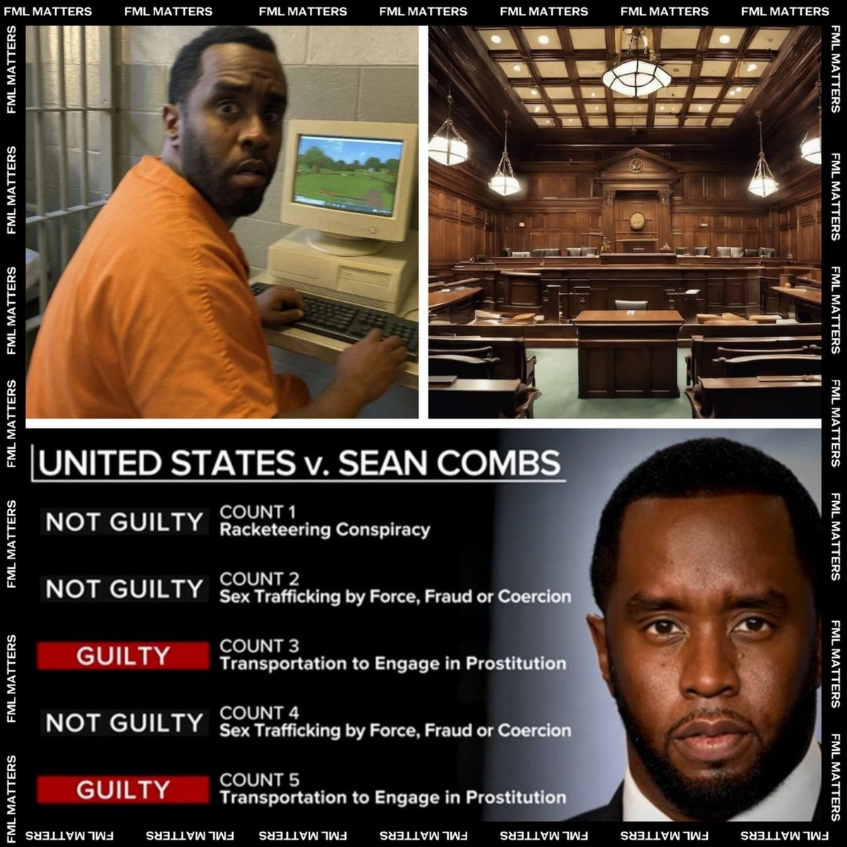 В ответ на пост 🚨 P. DIDDY ПОЛУЧИТ ВСЕГО 10 ЛЕТ ТЮРЬМЫ! Шон признан виновным по двум из пяти предъявленных обвинений. Суд установил его вину в незаконной транспортировке людей с целью проституции (в отношении Кэсси и Джейн). По этим статьям ему грозит не более 10 лет лишения свободы. В то же время, Комбс был оправдан по более серьёзным обвинениям: торговле людьми и участию в преступном сговоре (RICO). Обвинения в торговле людьми в сексуальных целях в отношении обеих пострадавших (Кэсси и Джейн) также были сняты. Услышав вердикт, Комбс сложил руки в молитве и губами прошептал присяжным: «Спасибо, спасибо» Комбс отвергал все выдвинутые против него обвинения, а его адвокаты уже сегодня вечером требуют его немедленного освобождения до вынесения приговора, поскольку он больше не обвиняется в торговле людьми для сексуальной эксплуатации, и предложили залог в $1 млн. 💀 FML MATTERS