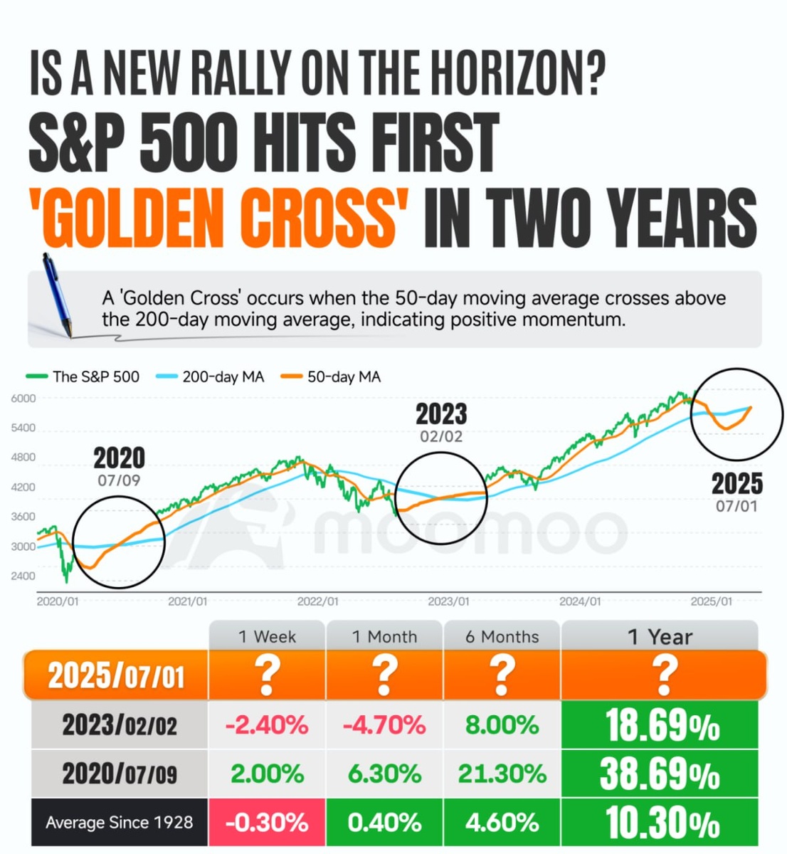 📊 Согласно историческим данным, после золотого пересечения индекс S&P 500 имеет 71,3% вероятность роста в течение следующего года, при этом среднегодовая доходность составляет более 10,3%