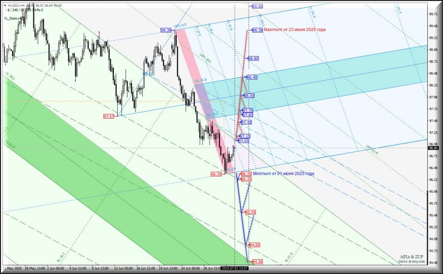 https://basechop.ru/wordpress/?p=49051 Операционный масштаб Minute (таймфрейм h4) #USDX – h4 – обзор вариантов движения с 03 июля 2025 г. Предыдущий обзор US Dollar Index (таймфрейм Daily) от 25.06.2025 г. 16:34 ____________________ US Dollar Index #USDX-h4 с 03 июля 2025 года станет развивать свое движение исходя из отработки и направления пробоя достаточно широкого диапазона: – уровень сопротивления 97.05 на начальной линии SSL вил старшего операционного масштаба Minute-h4; – уровень поддержки 96.35 – minimum от 01 июля 2025 года на начальной линии SSL вил младшего операционного масштаба Minuette-h1. Восходящее движение. В случае совместного пробоя уровня сопротивления 97.05 на начальной линии SSL вил старшего операционного масштаба Minute-h4 и нижней границы канала 1/2ML Minuette-h1 (97.15) развитие движения US Dollar Index может быть продолжено к границах канала 1/2 Median Line Minuette-h1 (97.15 – 97.45 – 97.70) и зоны равновесия (97.60 – 98.00 – 98.40) вил младшего…