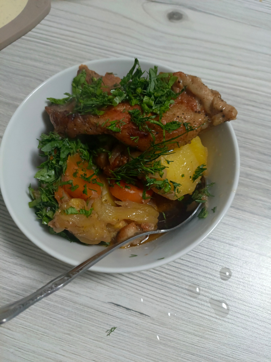 Далее укладываем маринованные кабачок и картофель. Пару стейков нарезаем небольшими кусочками начиняем картофель.