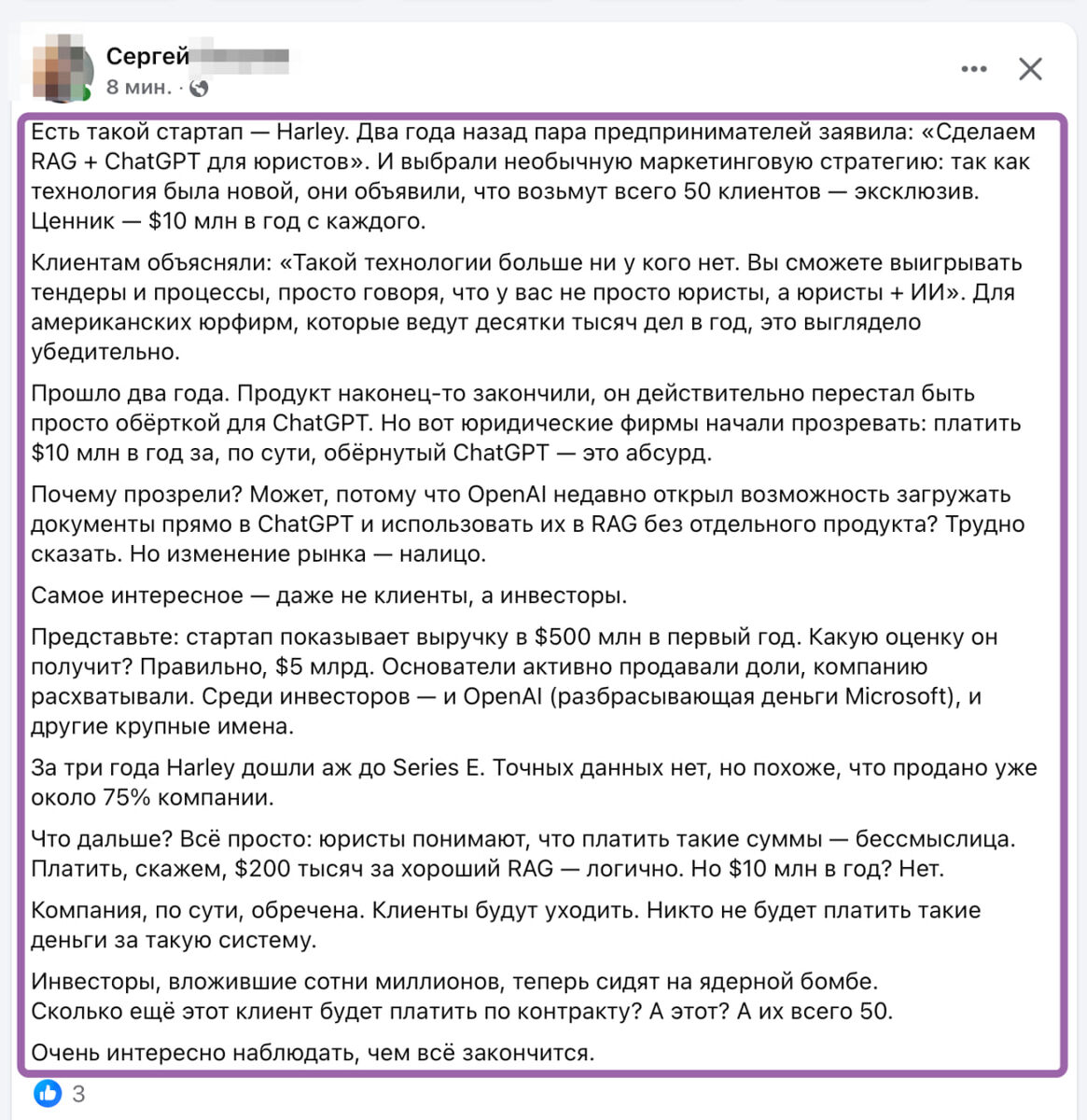 Сергей интересно пишет, не удержался прямо - вот почему обертки над ИИ от гигантов - дело слегка тревожное :) Цитирую, если на картинке лень читать (ссылку не даю - запрещен ФБ в РФ). Итак: "Есть такой стартап — Harley. Два года назад пара предпринимателей заявила: «Сделаем RAG + ChatGPT для юристов». И выбрали необычную маркетинговую стратегию: так как технология была новой, они объявили, что возьмут всего 50 клиентов — эксклюзив. Ценник — $10 млн в год с каждого. Клиентам объясняли: «Такой технологии больше ни у кого нет. Вы сможете выигрывать тендеры и процессы, просто говоря, что у вас не просто юристы, а юристы + ИИ». Для американских юрфирм, которые ведут десятки тысяч дел в год, это выглядело убедительно. Прошло два года. Продукт наконец-то закончили, он действительно перестал быть просто обёрткой для ChatGPT. Но вот юридические фирмы начали прозревать: платить $10 млн в год за, по сути, обёрнутый ChatGPT — это абсурд. Почему прозрели? Может, потому что OpenAI недавно отк