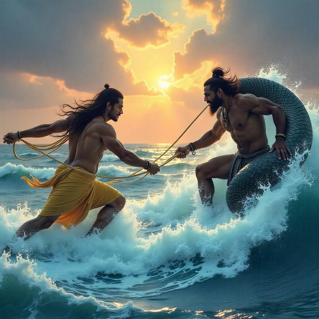 Миф как метафора психики Древний индуистский миф о "Пахтании Молочного океана" (Самудра-мантан) повествует о том, как боги и асуры, объединившись, взбивали океан, чтобы добыть амриту — напиток бессмертия. В процессе на поверхность всплывали как сокровища (Лакшми, луна, белый слон), так и смертельный яд (калакута), который едва не уничтожил мир. Этот миф — идеальная метафора работы человеческой психики. Бессознательное — наш внутренний океан, где скрыты и величайшие дары (творчество, мудрость, любовь), и разрушительные силы (страхи, травмы, агрессия). Чтобы обрести целостность, человек, подобно богам и асурам, должен "взбить" глубины своей души, столкнувшись и с ядом, и с благом. «Никто не должен отрицать опасность спуска... за каждым спуском следует восхождение»