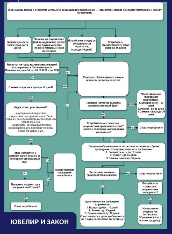 Шпаргалка по работе с претензиями по браку для магазина от юристов. Что делать если пришел недовольный клиент и потребовал возврат денег/ремонт/обмен. Пошаговый алгоритм, подготовленный юристами на основании закона. «Ювелир и закон» в Telegram | ВКонтакте | MAX | Дзен | Сетка