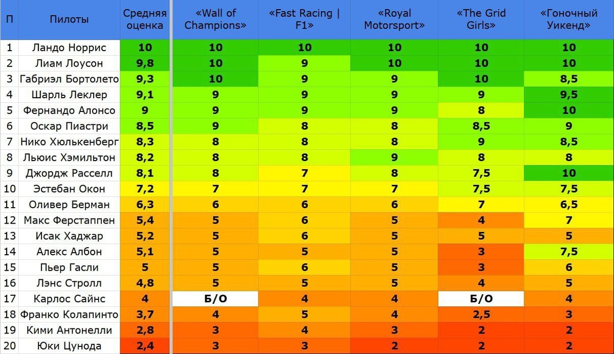 Оценки гонщиков на Гран-при Австрии: Ландо провёл идеальный уикенд с точки зрения результата. В квалификации, хоть соперников и устранили жёлтые флаги, но всё же потягаться с ним за поул вряд ли кто-то мог. Однако в гонке не всё так однозначно: Пиастри весь первый отрезок, как выразился Хорнер, «занимался любовью с выхлопной трубой болида Норриса». Заслуга это Пиастри или же болида Маклрен, я судить не берусь, но всё же то, сколько кругов он может ехать прямо за другим болидом, не может не удивлять. Ферстаппен не раз в этом сезоне ехал в темпе Маков кругов 5, оставаясь в крыле, но потом отпускал, чтобы совсем не убить шины, и ехал значительно медленнее. Маки же могут ехать друг за другом в борьбе хоть 20 кругов и при этом не убивать резину. Недоумение РБ абсолютно объяснимо. Я надеюсь Макларен не сможет перенести это же свойство на следующий сезон, иначе опять с ними никто не сможет потягаться. В дальнейшем по гонке они решили создать искусственный разрыв между своими гонщиками, чтобы