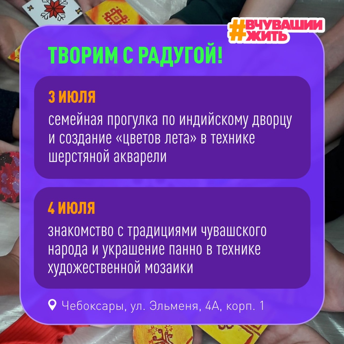 #вчувашиижить – ко Дню семьи по музеям побродить Любите и наблюдать за чужим творчеством, и творить самостоятельно? Присмотритесь к проекту «Папа, мама, я — музейная семья» от культурно-выставочного центра «Радуга». Ловите программу на ближайшие дни! Но помните: на мастер-класс лучше приходить по записи. Тел. (8352) 31-50-50, +7 (906) 388-93-20 (Telegramm, WhatsApp). Когда: 3, 4 июля 14.00. Подписаться/ Предложить новость