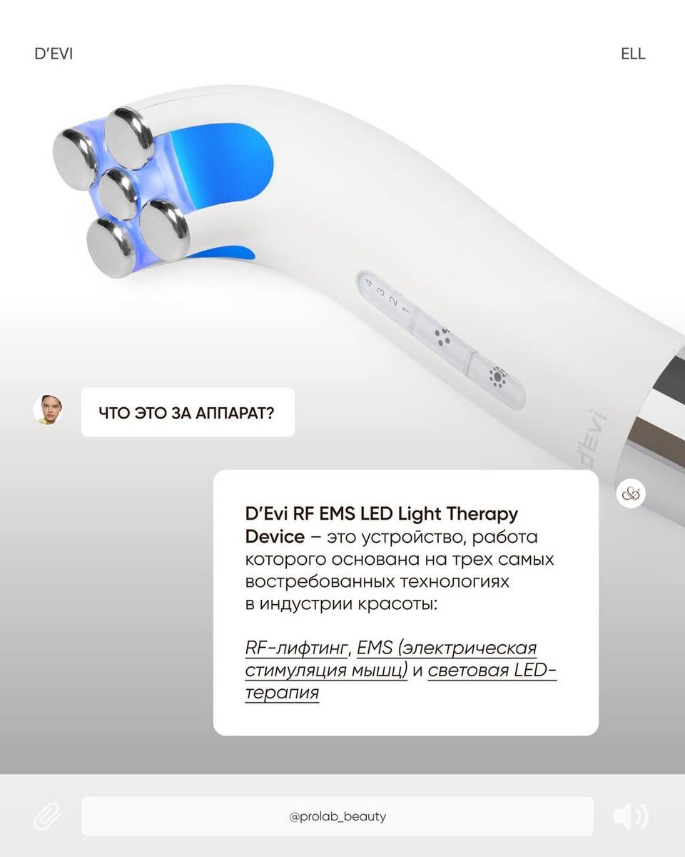 Все вопросы долой, ведь мы прилагаем самые точные ответы🫶🏻 Все об аппарате D’Evi RF EMS LED Light Therapy Device Гаджет сочетает в себе три технологии: RF-лифтинг + EMS-терапия и LED-режим • EMS-терапия + RF-лифтинг У прибора 5 массажных наконечников, которые обеспечат хороший лимфодренажный эффект. EMS-стимуляция активирует кровообращение, что ускоряет насыщение тканей кислородом, способствует выводу токсинов и освежает цвет лица. • LED-терапия Устраняет тусклость, покраснения и выравнивает тон. Однако гаджет D’Evi RF EMS LED Light Therapy Device не только SOS-помощь. При курсовом использовании благодаря терапии светом можно решить практически все проблемы кожи, а режим EMS-терапии и RF-лифтинга придаст коже упругость, поможет подтянуть контуры и разгладить морщинки. Пишите «+» в комментарии, если остались вопросы и наши специалисты свяжутся с вами, что бы рассказать подробнее ❤️