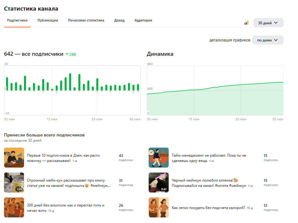 Я рассчитывал к началу июля пробить 1000 подписчиков. Но имею всего 642. Причём часть из них (примерно 5–10%) — это взаимные подписки, которые не самые активные. Пусть так. Главное — стабильность.
