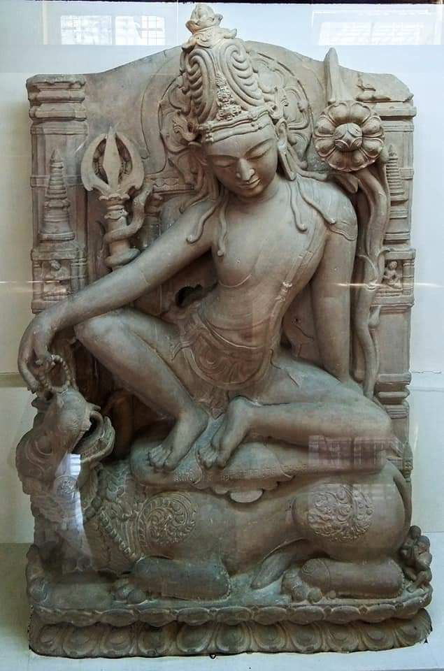 Божество из Махобы. На изображении представлена скульптура, которая, вероятно, изображает божество из индийской мифологии. Это может быть Шива, один из главных богов индуистской триады. Его часто изображают с трезубцем (тришулой), который символизирует его власть над тремя мирами: физическим, духовным и небесным. Змея, обвивающая его тело, — это Нага, символ мудрости, защиты и энергии. Символика: Трезубец (тришула) — символ разрушения, трансформации и возрождения. Змея — символ энергии Кундалини, которая поднимается по позвоночнику, соединяя физическое и духовное. Поза божества указывает на его спокойствие и контроль над энергией.