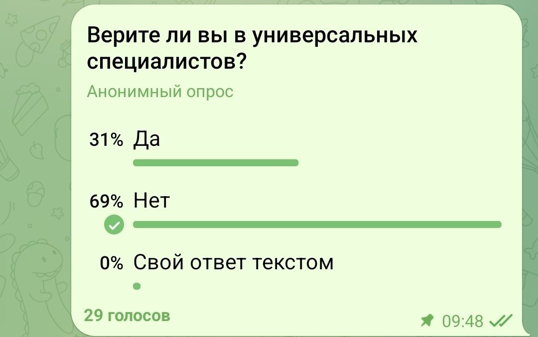 Продолжение темы «Продажи и репутация» Частая тема, всплывающая в бизнесе, — это поиск специалиста по цене трёх. Это желание понятно, естественно и оправдано высокими расходами на ведение бизнеса в условиях неопределённости либо на старте. Что происходит во «взрослых» бизнесах и у хорошей целевой аудитории? Ко мне на консультации приходят с запросом на «другую целевую аудиторию» — в том числе и с этим вопросом. Такие люди уже прошли путь, набили шишек и понимают, что универсалов не существует. Когда они видят, что вы «HR, журналист и бизнес-ассистент» (реальный случай из моей практики), они уходят в туман. Чаще молча. Но я не молчу: сейчас помогу вам в продажах, начав с основы основ — позиционирования. Что такое универсал, которому не доверяют, видя набор его компетенций? Разберёмся. Это — набор тех компетенций, в которых очевидно нужно налетать 10 000 часов, чтобы называться специалистом. Я уже не говорю про вашу природу и внутренние качества. У балерины и пожарного они разные —