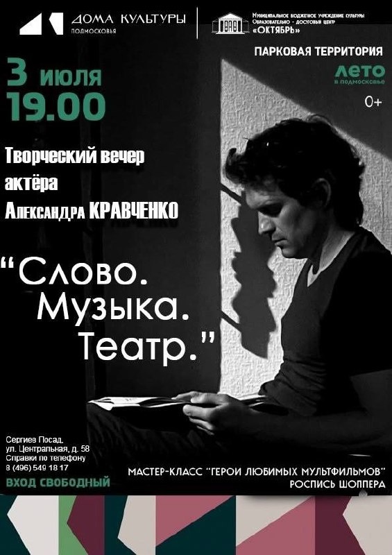 Творческий вечер актера Александра Кравченко «Слово. Музыка. Театр» В рамках проекта #ЛетоДляТебя Вход свободный (Мастер-класс от 200 рублей) Приходите к нам каждый вторник и четверг в 19.00 на творческий проект #ЛетоДляТебя! С нами всегда весело и интересно! #одцоктябрь